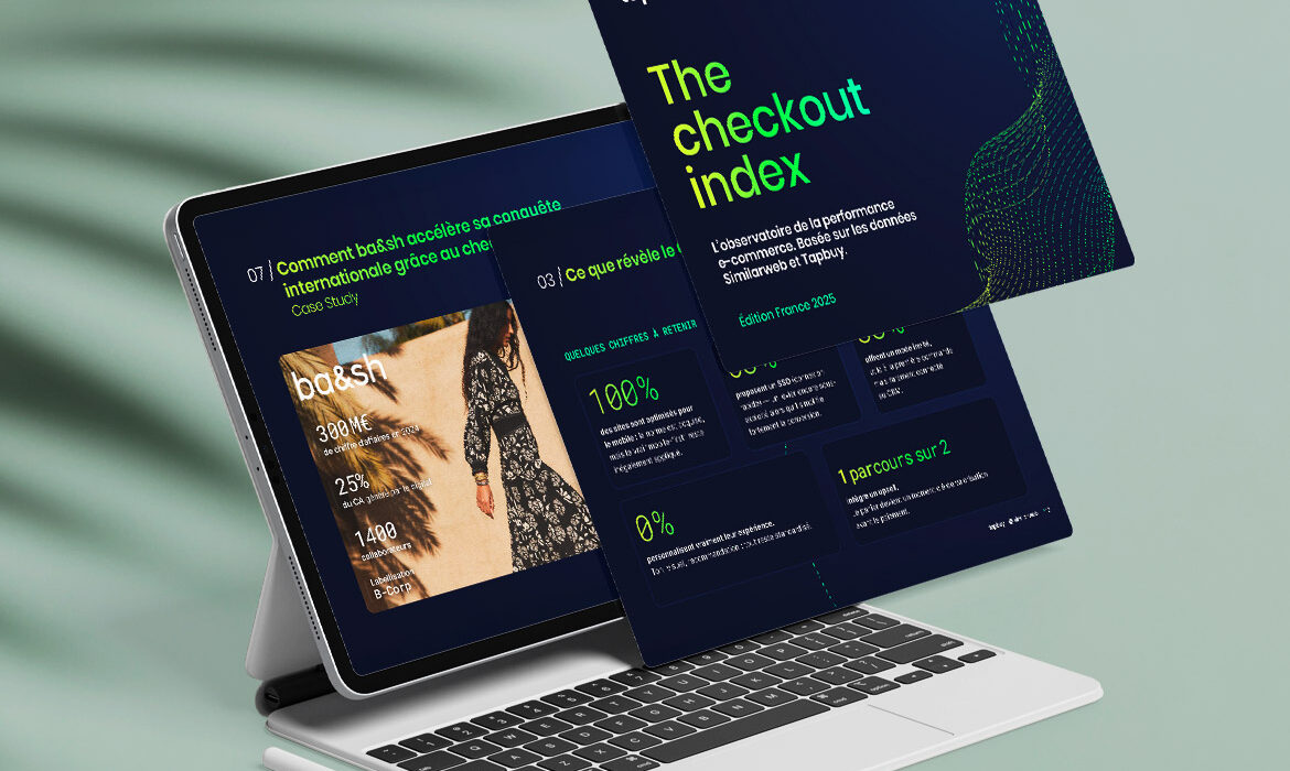 Réalisation graphique et mise en page du livre blanc The Checkout Index pour Tapbuy, en collaboration avec l’agence Yumens. Un projet mêlant clarté, lisibilité et identité visuelle au service du contenu.